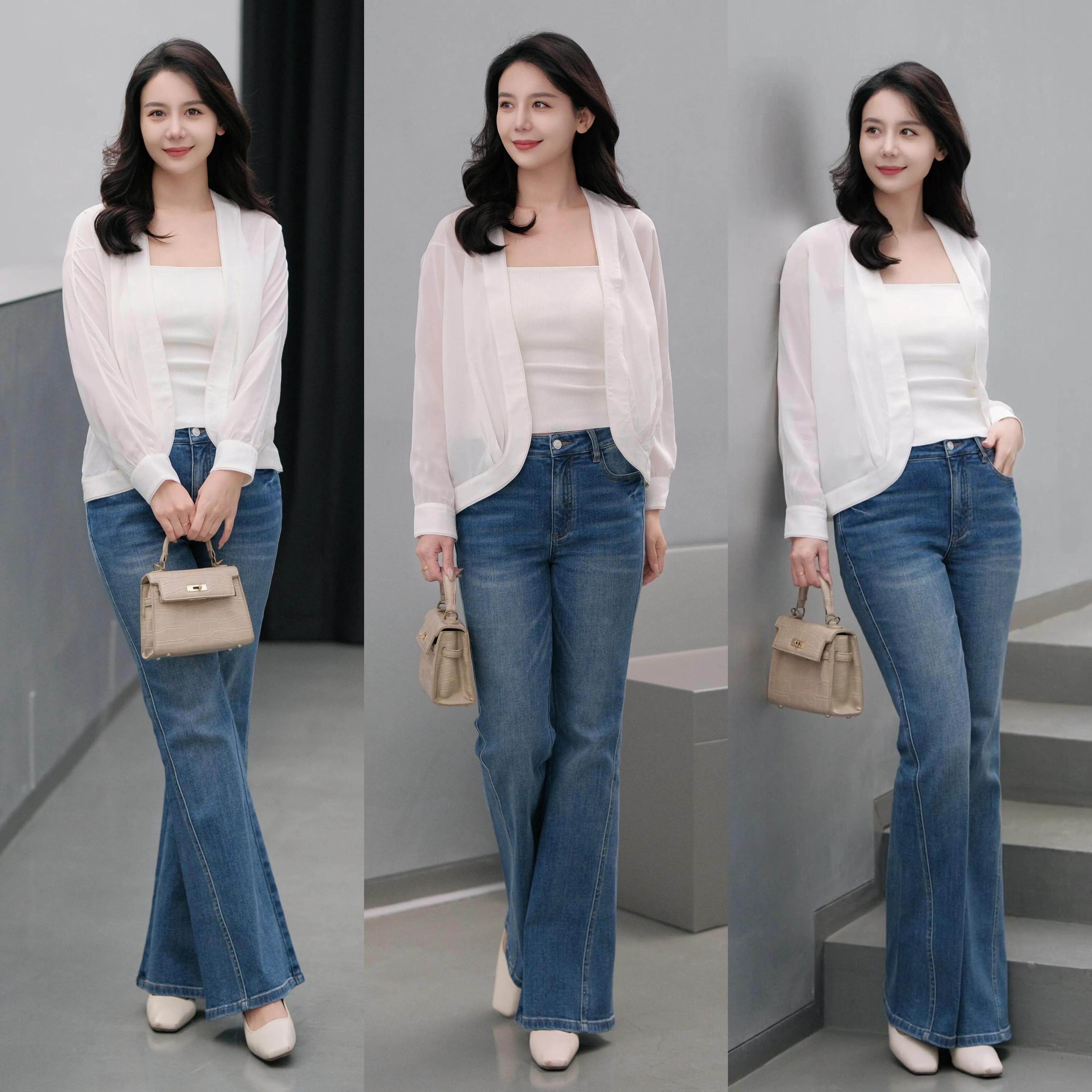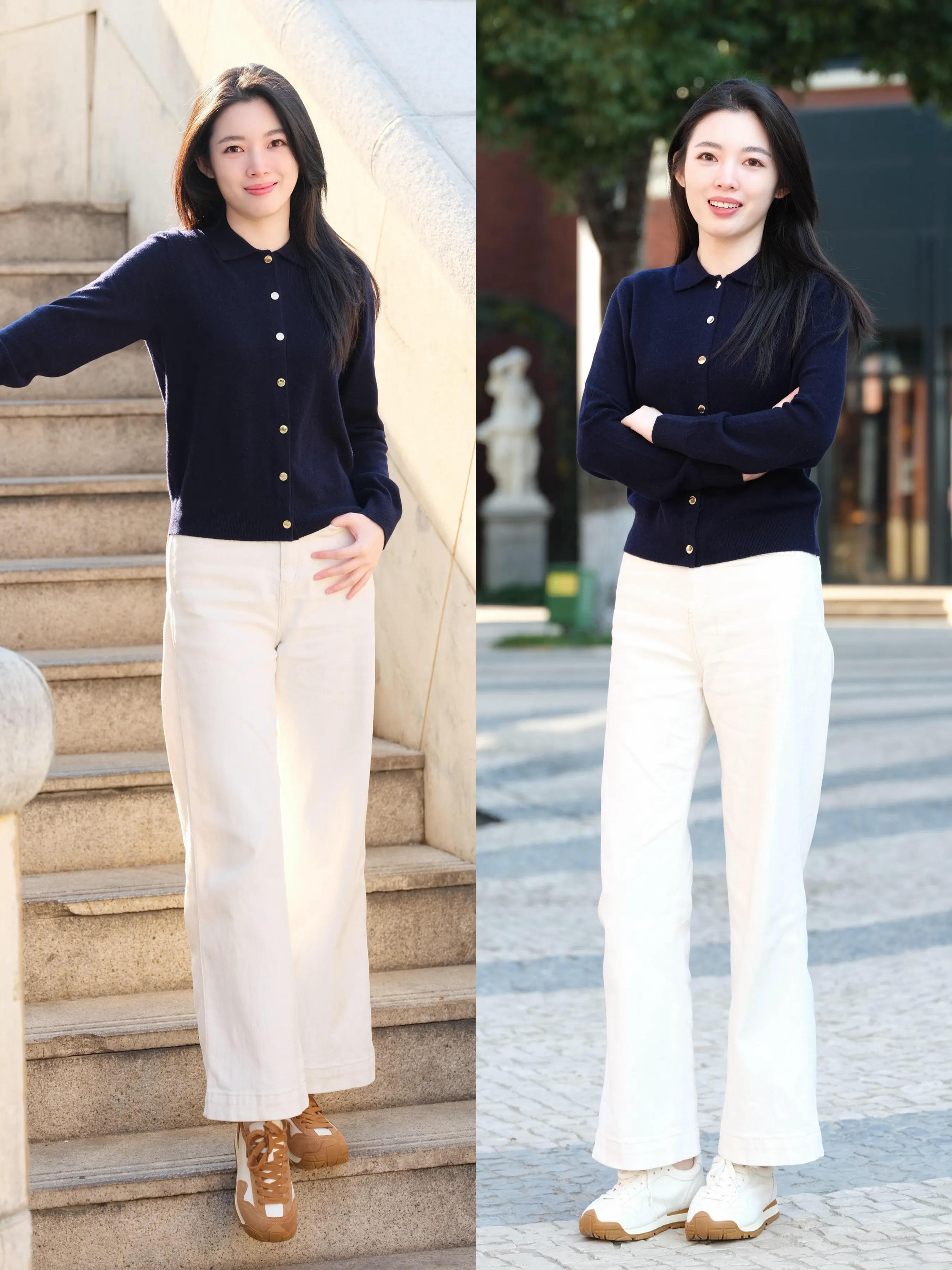 第一章节,如何把牛仔裤穿出独属于自己的时尚感?Tips①:白色开衫+蓝色牛仔裤
