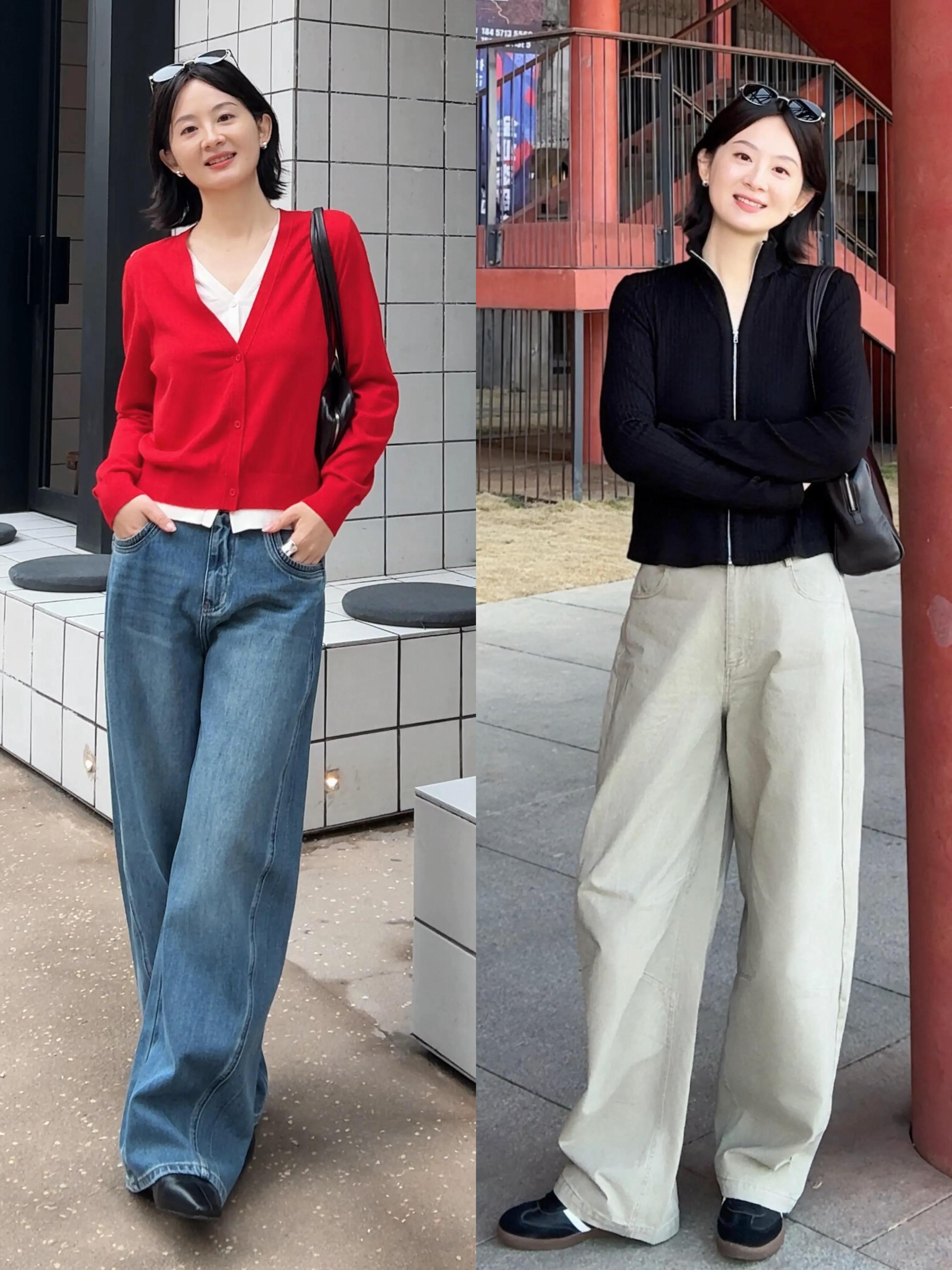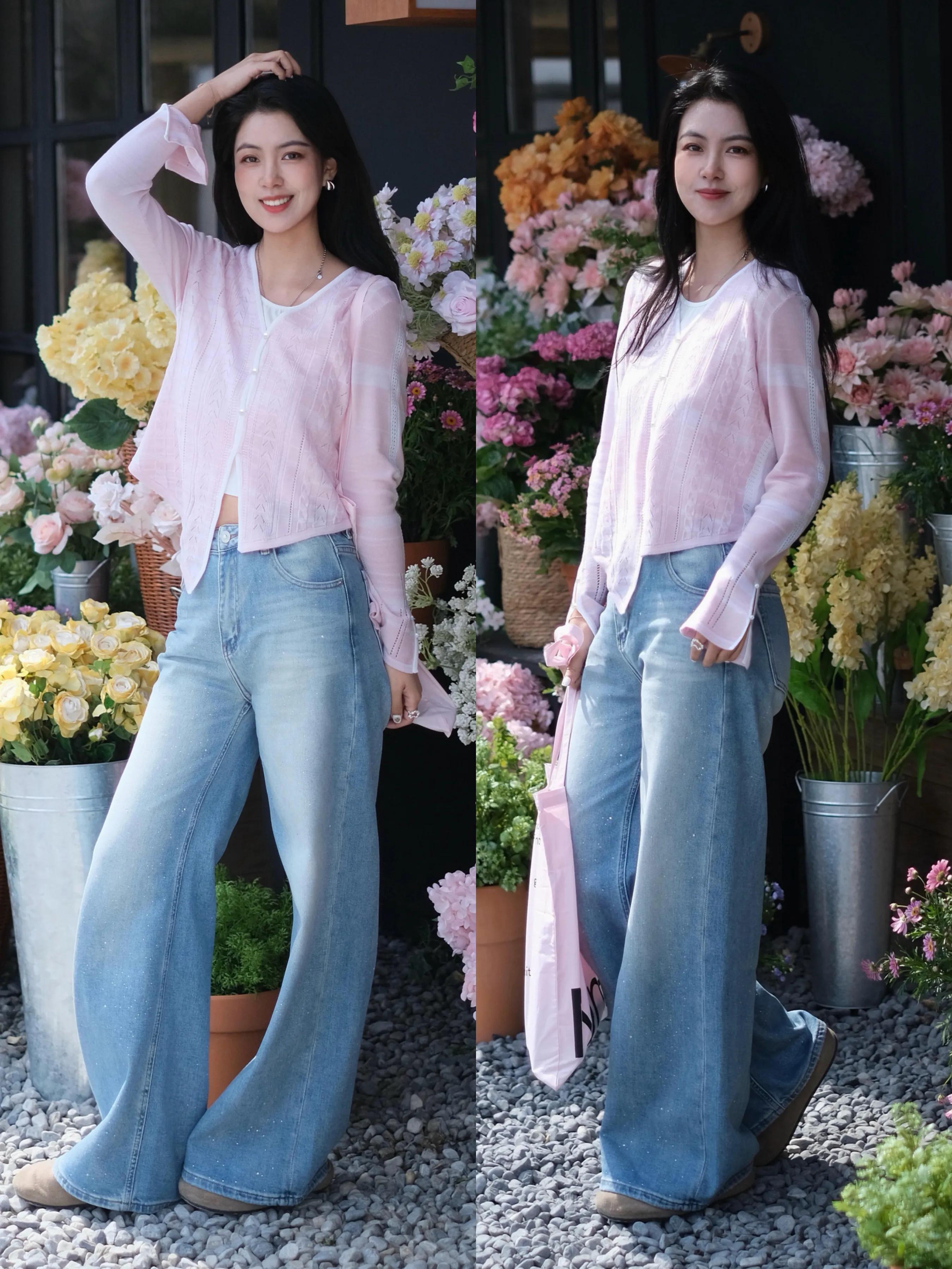 偏爱少女感,可选一件粉色的短款开衫,内搭短款 T 恤和一条蓝色的牛仔阔腿裤,可以遮住胯宽腿粗等问题,而且属于上短下长穿搭,可以很好地呈现三七分的身材比例,显高显瘦。