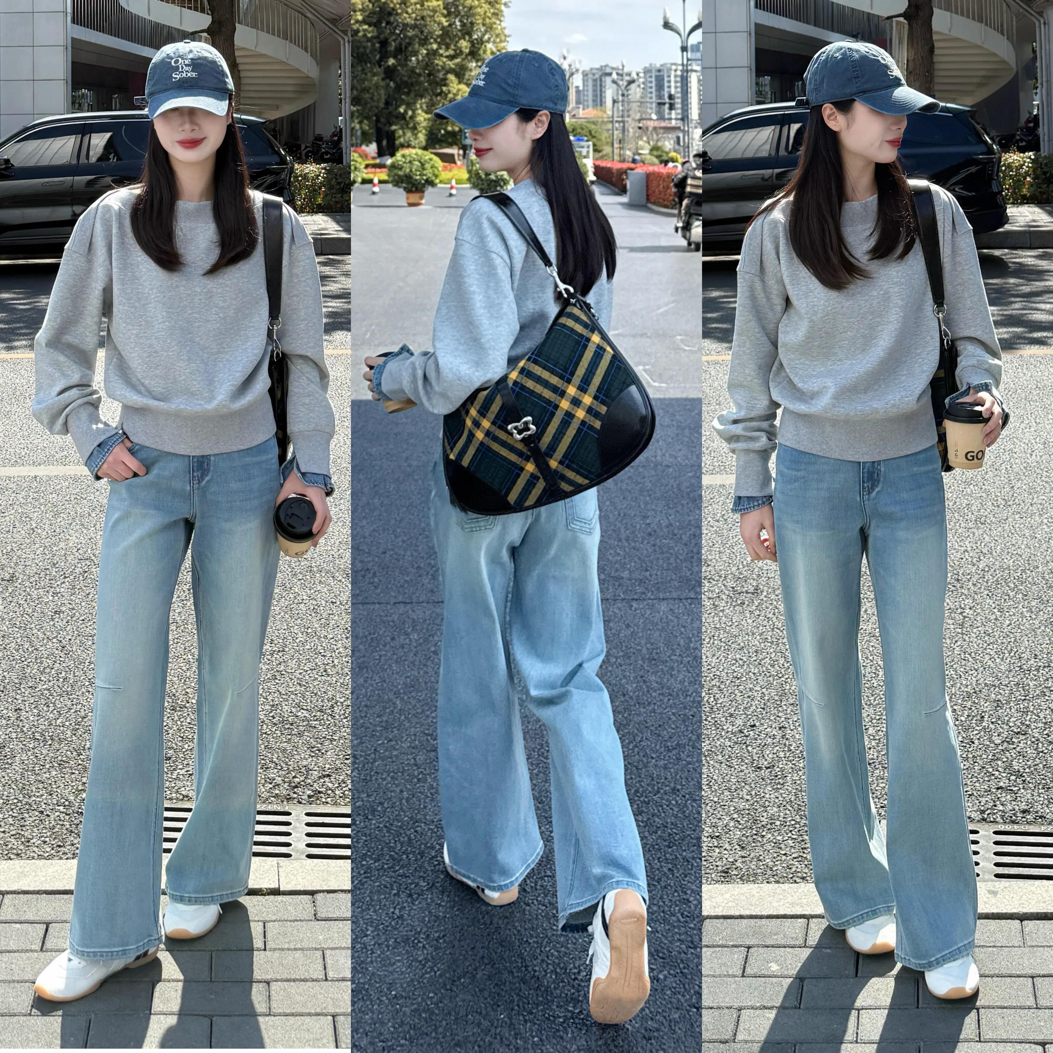 Tips④:灰色卫衣+蓝色牛仔直筒裤