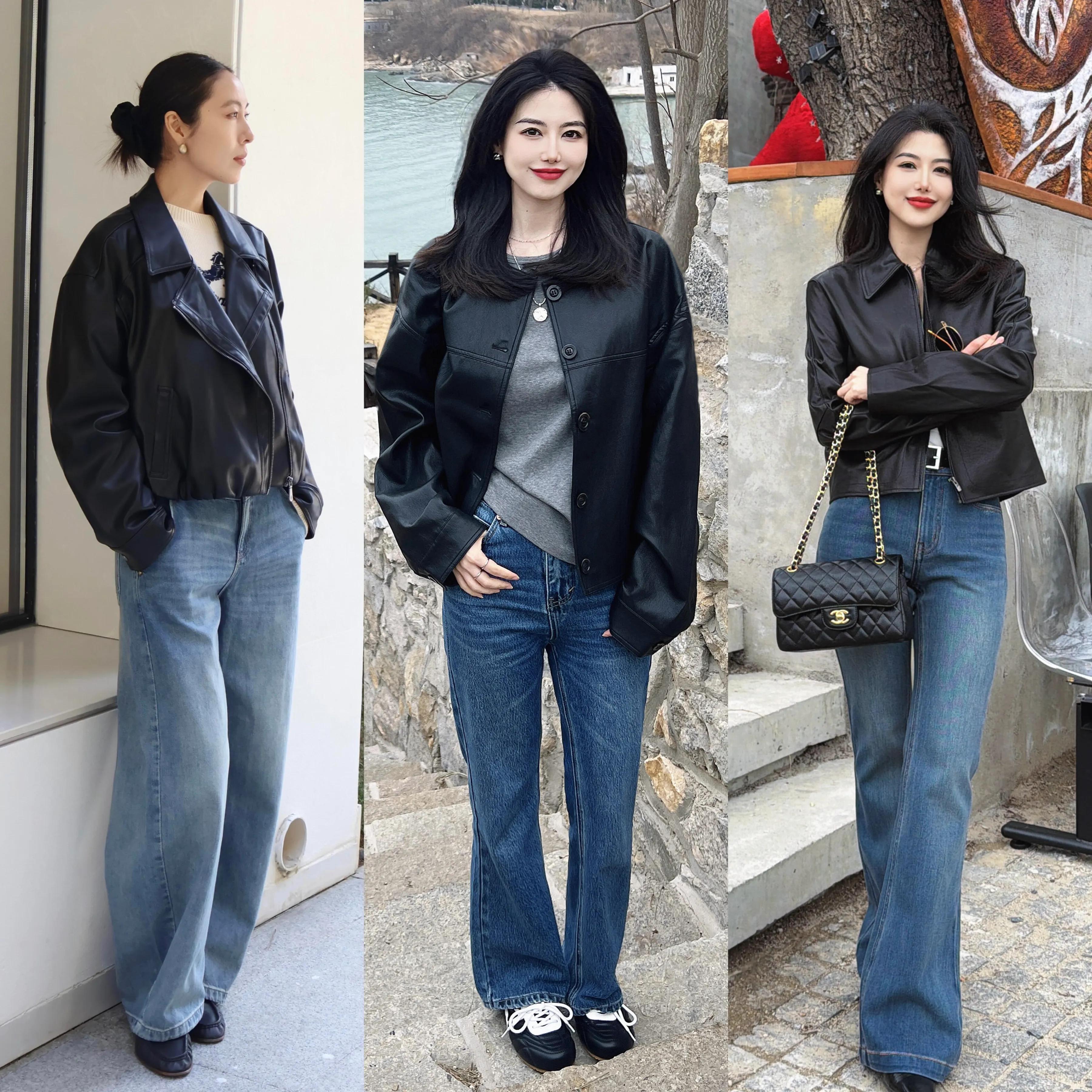 若是你偏爱比较酷的造型,可以选择黑色的皮衣外套,内搭一件针织衫和蓝色的牛仔裤,脚踩乐福鞋、德训鞋、皮鞋都可以,能让你变得又酷又美,很飒爽。