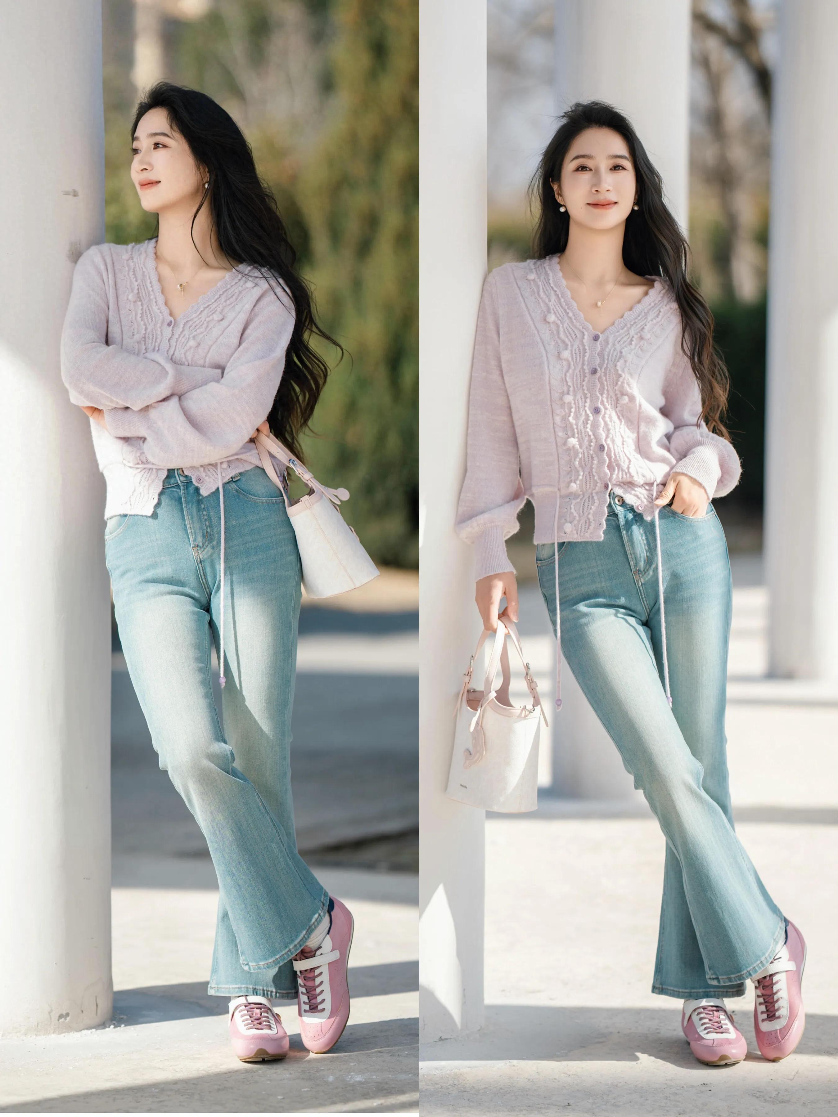 春风吹来,带着暖意,不必裹得严严实实,选择清爽舒适的衬衫、针织衫配上牛仔裤更显 fashion。例如用浅紫色小众针织开衫配蓝色牛仔微喇叭裤,脚踩浅紫色德训鞋,俏皮又灵动。