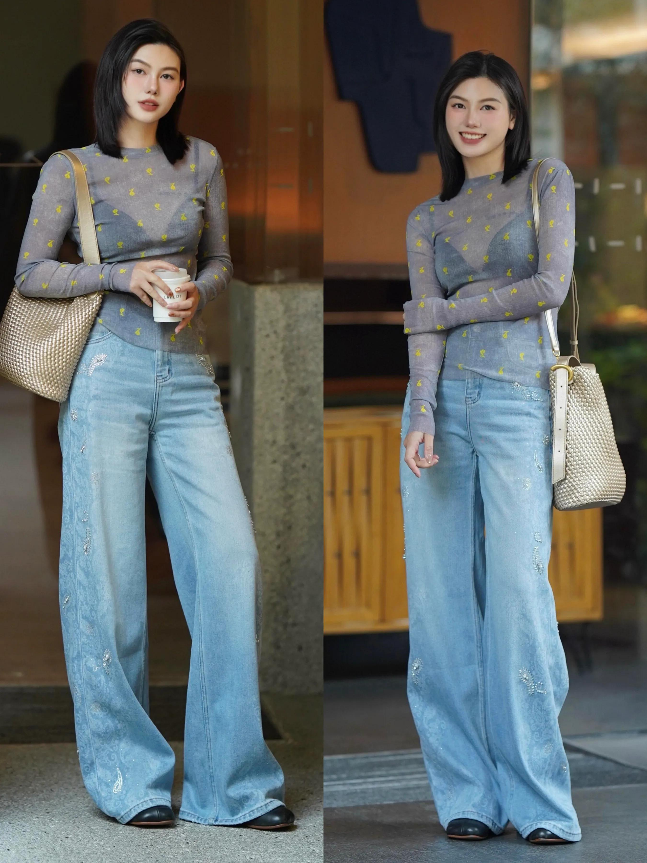 Tips④:印花薄款针织衫+蓝色牛仔阔腿裤