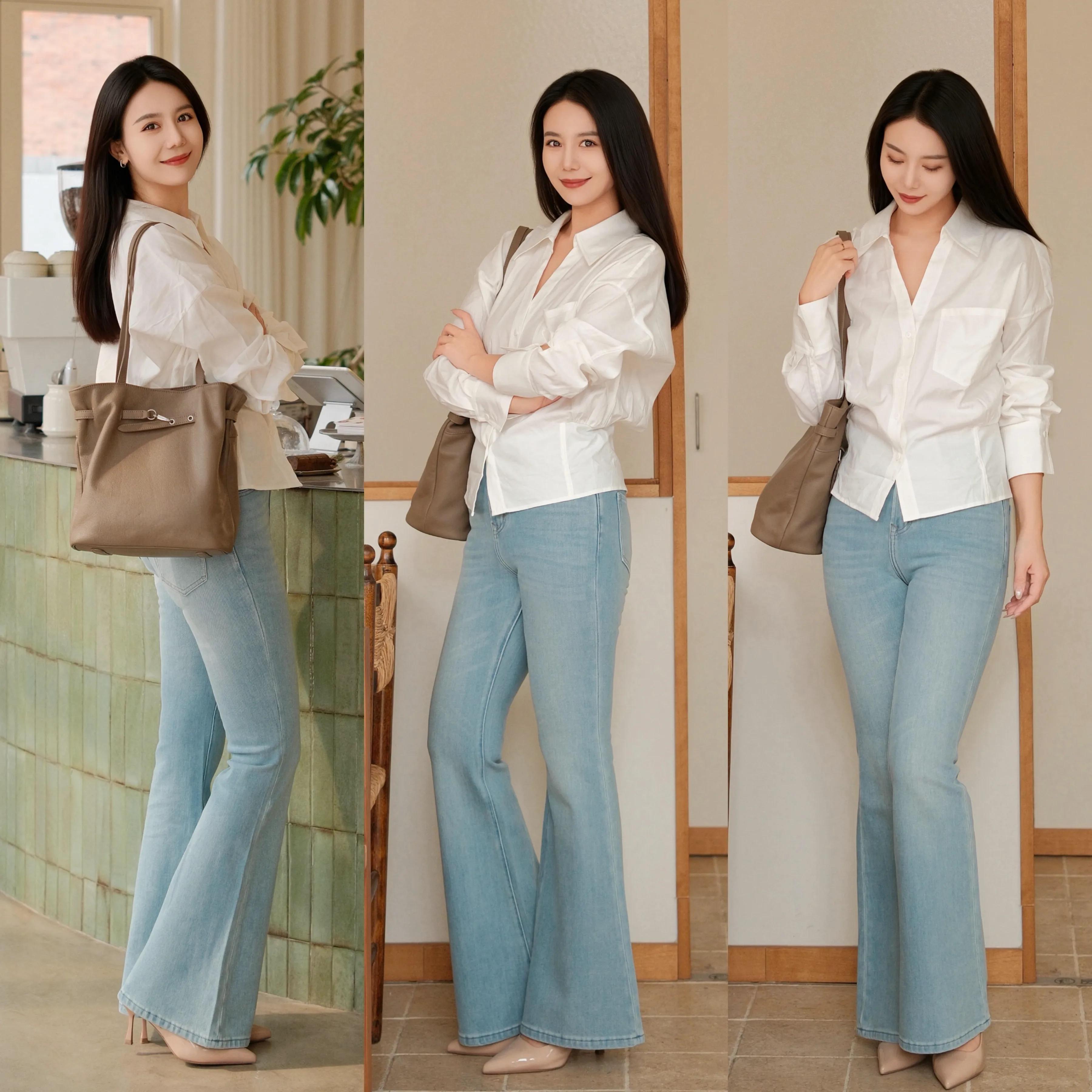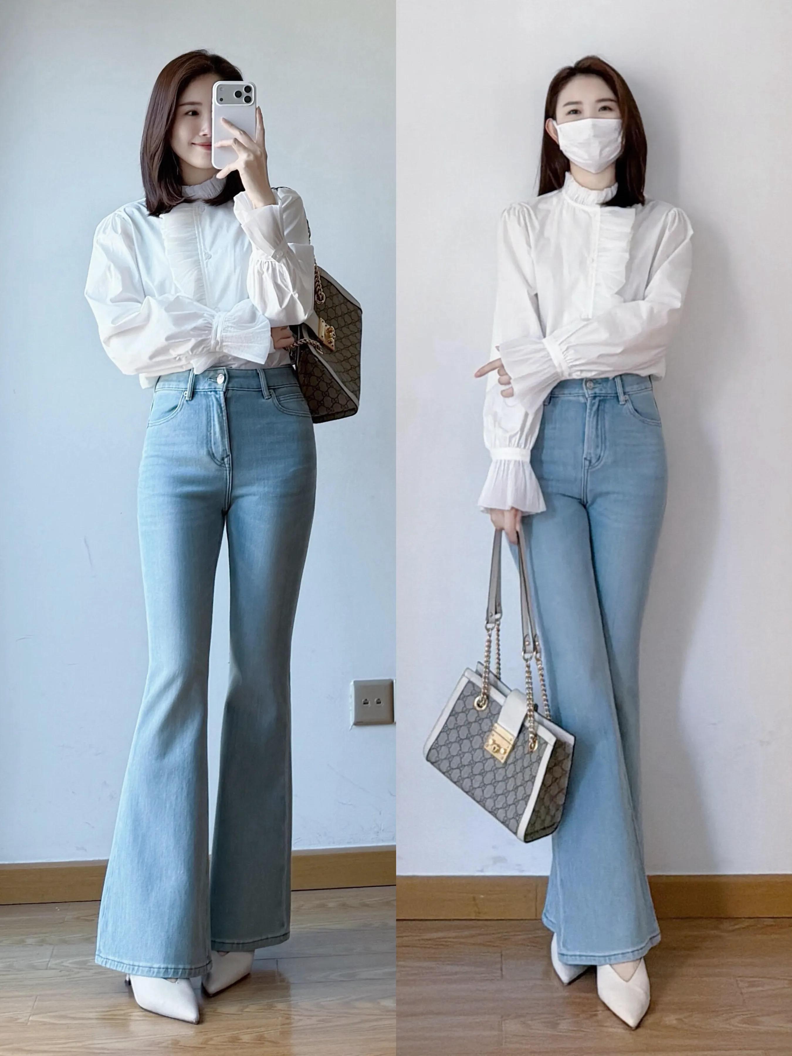 Tips③:白色小众衬衫+蓝色微喇叭牛仔裤