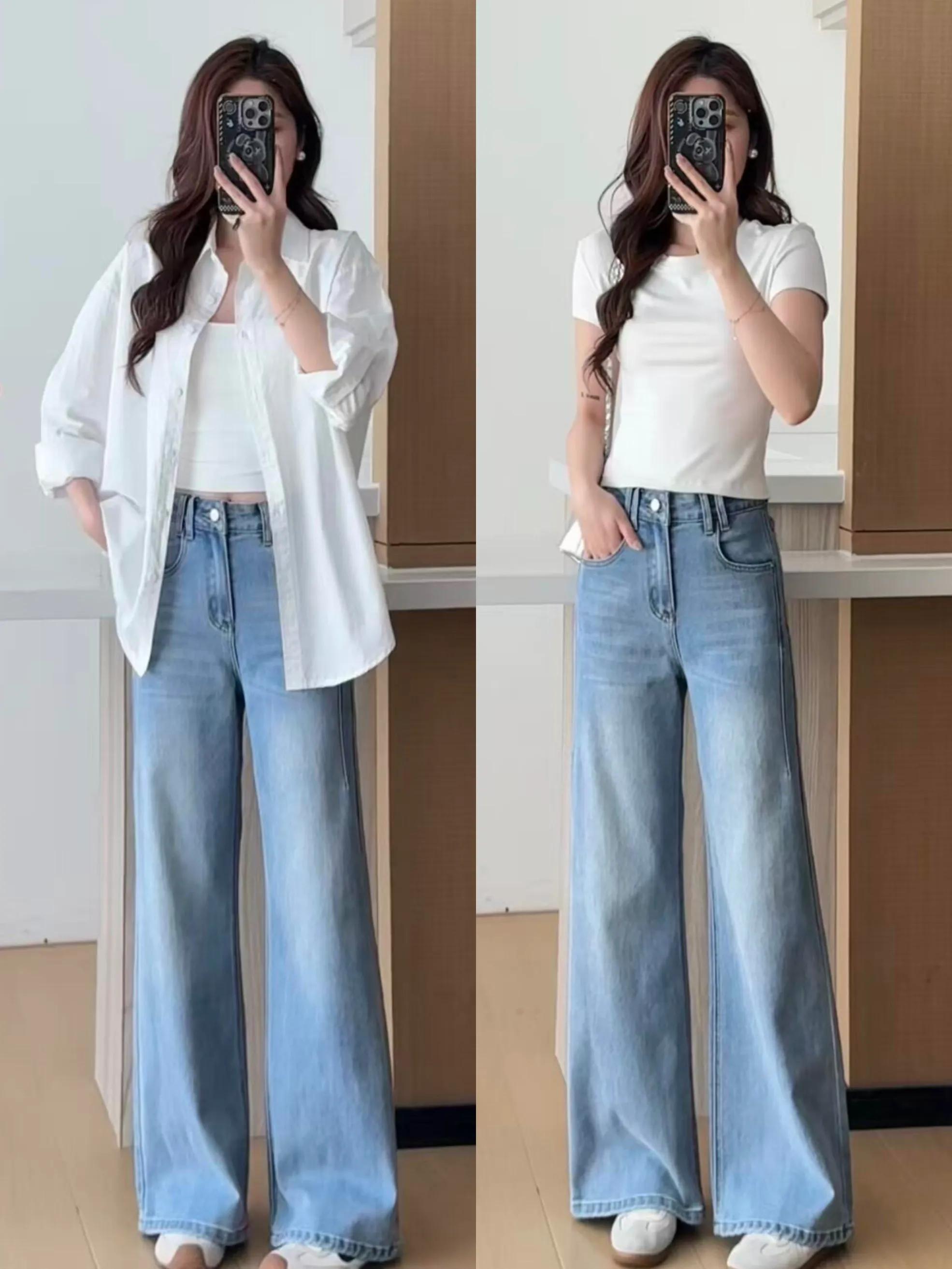 同样是阔腿裤,其实有很大的区别,像上面这一条牛仔直筒阔腿裤,穿在身上就显得很利落,腿也比较笔直,这时候可以选择短款的白 T 恤来搭配,或是用白衬衫内搭白吊带,配色简约,照穿不易出错,适合职场、日常、约会多场景穿搭。