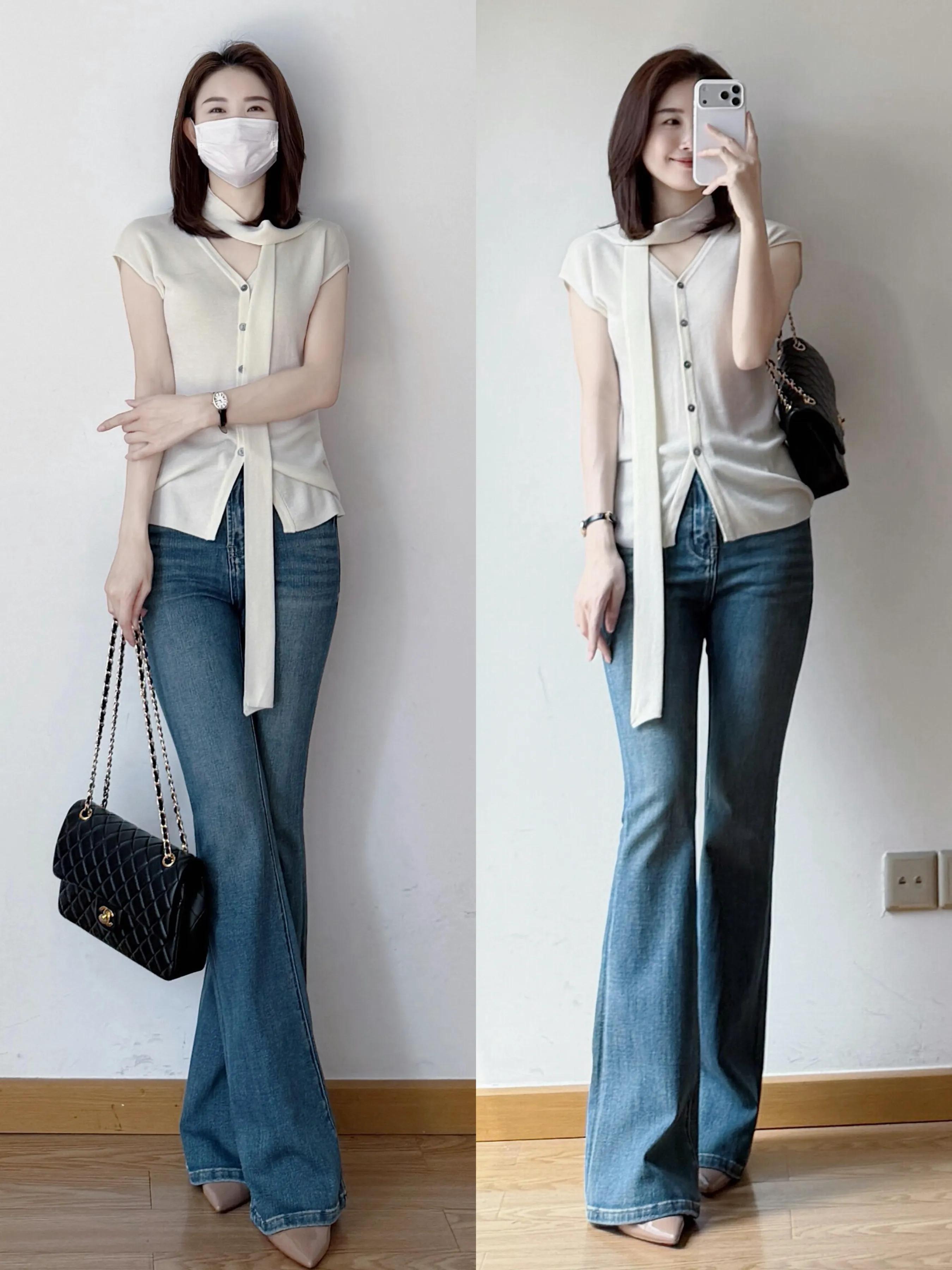 想让自己的穿搭温柔得体,不妨可选一件白色针织开衫,而且透气性很好,配上蓝色微喇叭牛仔裤,可以呈现出你的高挑身材,同时又变得温柔又大方。