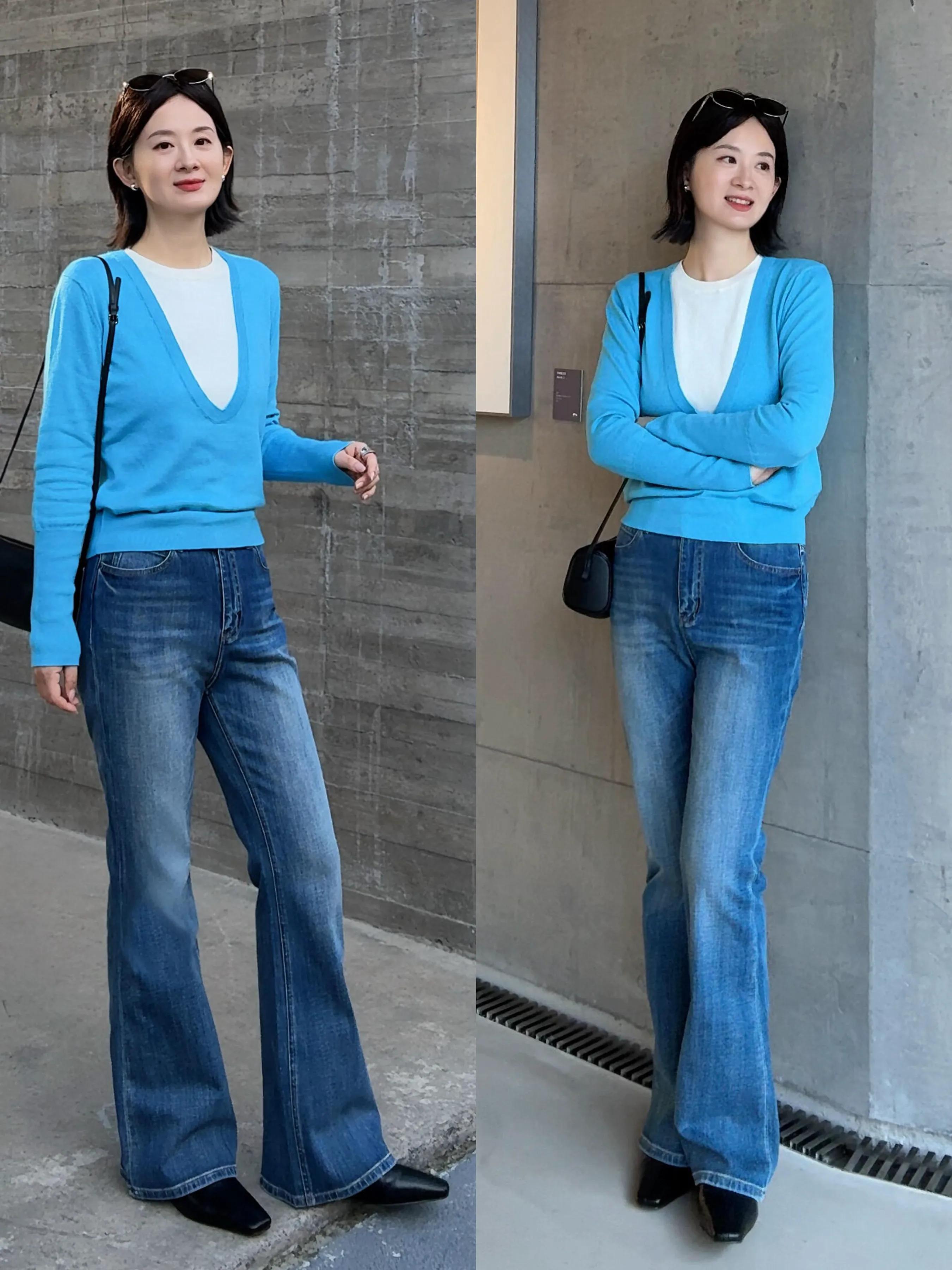 或是选择一件浅黄色开衫内搭白衬衫和蓝色微喇叭牛仔裤组合,这种撞色穿搭层次感更好,解决穿衣打扮过于单调问题。